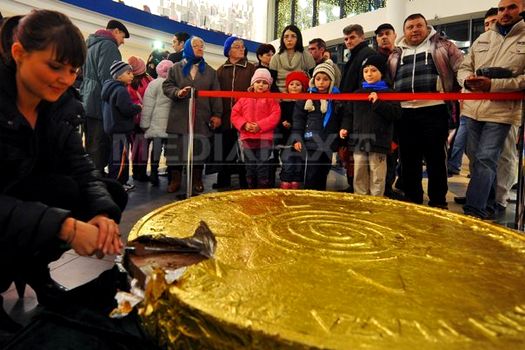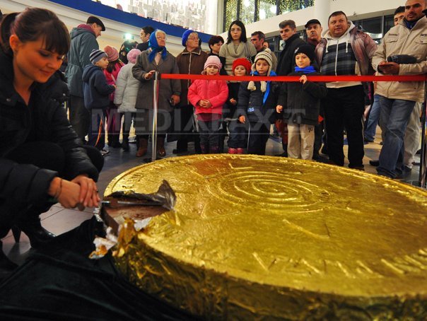 Moneda, învelită în staniol auriu, va sta expusă în Sun Plaza, în zona Blue Atrium, timp de două săptămâni, după care va fi împărţită copiilor din centrele de plasament din Sectorul 4, după cum a spus primarul.