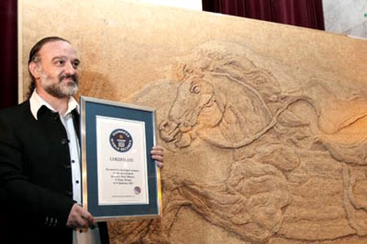 Aceasta este a treia tentativă a artistului de a ajunge în Cartea Recordurilor, după un portret al lui Leonardo Da Vinci, realizat din cuie, şi un tablou cu un cal în galop, făcut din scobitori.
