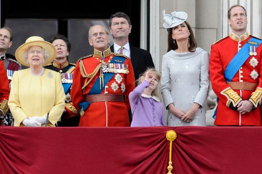 Cuplul regal, zâmbitor, a asistat de asemenea la o paradă aeriană, din balconul Palatului Buckingham, înconjurat de ceilalţi membri ai familiei regale.