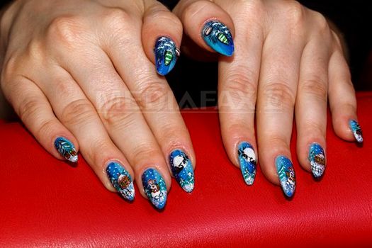 Ea aplică pe unghie un strat de vopsea de bază cu o pensulă mai lată, apoi, cu pensula subţire, pictează toate elementele de iarnă ca un tablou, iar la final presară pudră de sclipici pentru a da peisajului creat efectul de zăpadă.