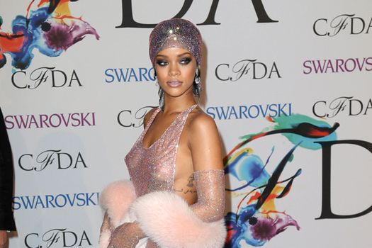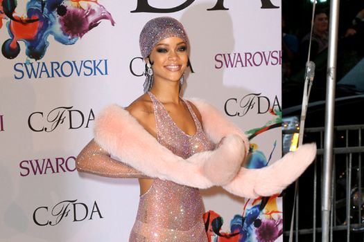 Rihanna a avut o apariţie de senzaţie pe covorul roşu, ea purtând o rochie din plasă strălucitoare, prin care lăsa să se vadă corpul, scrie abcnews.com.
