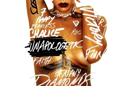Cântăreaţa Rihanna apare topless, cu trupul acoperit de cuvinte precum "credinţă", "fericit" şi "victorie", pe coperta noului său album, "Unapologetic".