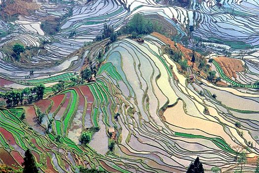 Nevoiţi să cultive orezul în această zonă, locuitorii din apropierea munţilor Yuanyang au creat terasele pentru a favoriza dezvoltarea culturilor.
