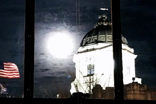 A rare occurrence called a #SuperBlueBloodMoon is seen behind the U.S. flag at Santa Monica Beach in #SantaMonica, California. https://t.co/q6pNjCTMMQ pic.twitter.com/THZ2FKDv19