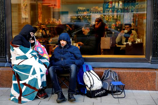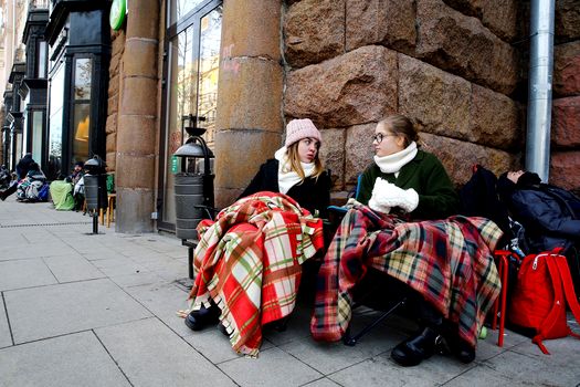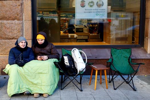 Două tinere aşteaptă la rând pentru a cumpăra noul iPhone X, în Moscova. Foto: Hepta
