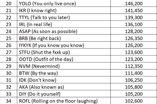 Intrigaţi să afle care astfel de abrevieri de text îi încurcă cel mai mult pe oameni, cei de la site-ul Case24.com/uk au extras datele despre volumul căutărilor globale (folosind instrumentul de analiză online Ahrefs.com) pentru 100 de abrevieri, pentru a descoperi care din acestea sunt cele mai greu de descifrat pe măsură ce utilizatorii online apelează la Google pentru clarificare.