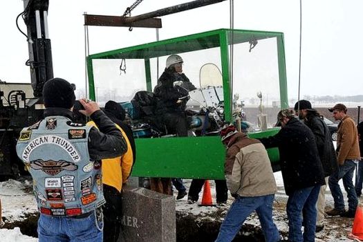Până aici nimic deosebit, însă se pare că bărbatul a dorit să fie înmormântat într-un sicriu transparent, pentru a putea fi văzut stând pe motocicleta sa.