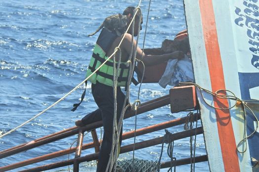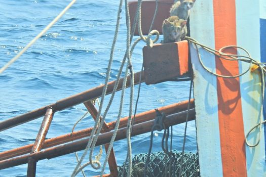 Un marinar a înotat către barcă, a pus cele 4 pisici în spate iar apoi a fost tras de către colegii săi, pe navă.