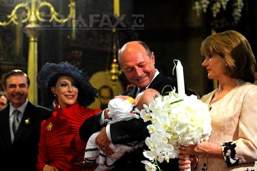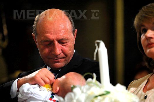 „Plânge, ca orice copil. (…) A fost foarte cuminte pentru un copil care iese prima oară în aglomeraţie şi nu-i obişnuit cu agitaţia. S-a speriat de blizuri, în primul rând. N-a văzut atâtea bliţuri de când e pe lume şi probabil şi vocile preoţilor puternice…”, a declarat după slujbă preşedintele Băsescu.