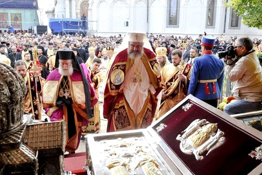 În aceste zile, prin grija Patriarhiei Române, la Bucureşti se află atât moaştele Sfântului Dimitrie, cât şi Capul Sfântului Andrei, moaştele Sfinţilor Împăraţi Constantin şi Elena, dar şi o icoană a Maicii Domnului „devenită făcătoare de minuni după ce s-a constatat că, deşi iniţial era pictată altfel, figura Fecioarei Maria s-a schimbat, având un uşor zâmbet”, după cum explica unul dintre oamenii Patriarhiei care se ocupau cu ordinea la obiectele de cult, absolvent de seminar teologic, după cum s-a recomandat.