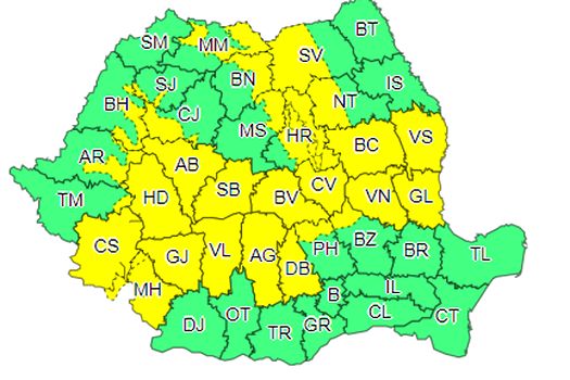 „În Banat, Oltenia, Crişana, Maramureş, Transilvania, nord-vestul Munteniei şi al Moldovei, precum şi la munte vor fi perioade cu instabilitate atmosferică accentuată ce se va manifesta prin averse torenţiale, descărcări electrice, intensificări de scurtă durată ale vântului, vijelii şi grindină. În intervale scurte de timp sau prin acumulare, se vor înregistra cantităţi de apă ce vor depăşi 25…30 l/mp şi pe arii restranse 40…60 l/mp”, precizează meteorologii.