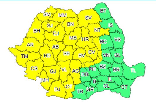 Primul Cod galben de instabilitate începe vineri, al ora 12:00, şi expiră la ora 22:00.