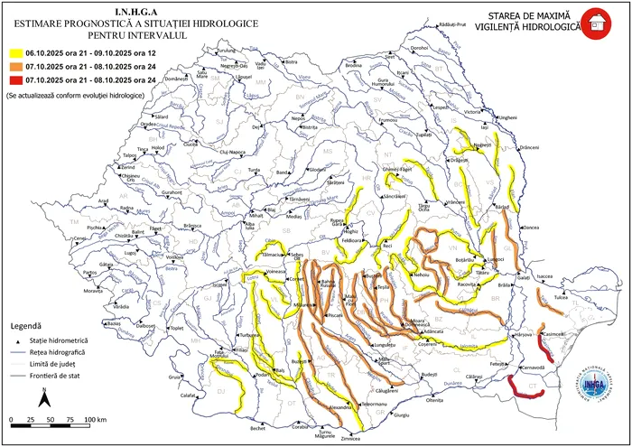 O avertizare Cod portocaliu vizează râurile din bazinele hidrografice: Călmăţui (judeţele: Olt şi Teleorman), Vedea (judeţele: Argeş, Olt şi Teleorman), Argeş (judeţele: Argeş, Dâmboviţa, Giurgiu, Teleorman şi Ilfov), Ialomiţa (judeţele: Dâmboviţa, Prahova, Ilfov, Ialomiţa şi Buzău), Călmăţui (judeţele: Buzău și Brăila), Buzău (judeţele: Buzău, Prahova și Brăila), Râmnicu Sărat (judeţele: Buzău şi Vrancea), Putna (judeţul Vrancea), Siret (judeţul Galaţi), Prut (judeţul Galaţi) și râurile din judeţul Tulcea.
