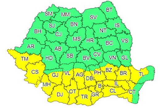 Potrivit ANM, sunt afectate de Codul galben următoarele judeţe: Timişoara, Caraş-Severin, Mehedinţi, Gorj, Dolj, Vâlcea, Olt, Argeş, Târgovişte, Dâmboviţa, Gorj, Prahova, Buzău, Brăila, Tulcea, Constanţa, Ialomiţa, Călăraşi şi Municipiul Bucureşti.