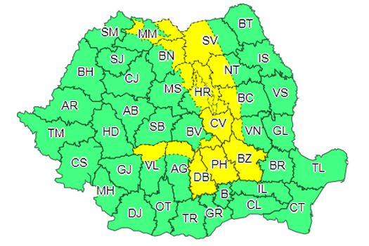 În acelaşi timp, de la ora 10:00 până la ora 23:00, în zona Carpaţilor Orientali şi local în Carpaţii Meridionali, precum şi în nordul Munteniei, vor fi perioade cu instabilitate atmosferică accentuată, ce se va manifesta prin averse care vor avea şi caracter torenţial, descărcări electrice, intensificări ale vântului, vijelii şi grindină. Cantităţile de apă vor depăşi pe alocuri 25 – 45 l/mp. Pentru aceste zone, meteorologii au emis un alt cod galben de instabilitate atmosferică.