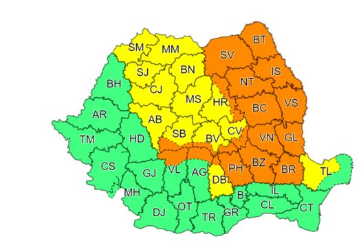 Tot până la ora 23.00. în Maramureş, Transilvania, Moldova, nordul Munteniei şi al Dobrogei şi local în zonele montane, vor fi perioade cu instabilitate atmosferică accentuată, ce se va manifesta prin frecvente descărcări electrice, intensificări ale vântului, vijelii, local averse ce vor avea şi caracter torenţial şi, izolat, grindină, aici fiind Cod galben. Astfel de fenomene, dar pe arii mai restrânse, vor fi şi în restul teritoriului.