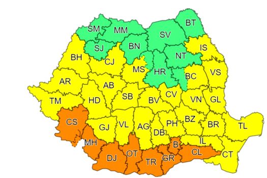 Potrivit Administraţiei Naţionale de Meteorologie (ANM), pe parcursul zilelor de joi, vineri, sâmbătă şi duminică, în judeţele Mehedinţi, Dolj, Olt, Teleorman, Giurgiu, Călăraşi, Ilfov, Bucureşti şi în sudul judeţului Caraş-Severin, disconfortul termic va fi deosebit de accentuat, iar indicele temperatură-umezeală (ITU) se va situa peste pragul critic de 80 de unităţi, în aceste zone fiind în vigoare o atenţionare Cod portocaliu. Temperaturile maxime se vor situa frecvent între 38 şi 40 de grade.