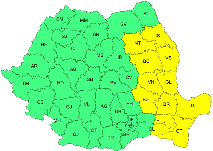 De joi, de la ora 20 până vineri, la ora 2, în județele Teleorman, Giurgiu, Călărași, Ialomița, Brăila, Buzău, Ilfov, municipiul București și în zona de litoral a județelor Constanța și Tulcea este cod portocaliu de vânt puternic. Vântul va avea intensificări puternice și susținute cu rafale de 70…90 km/h.