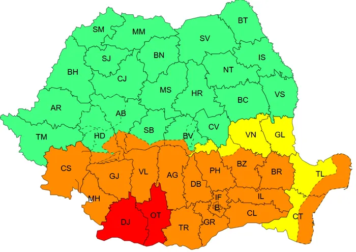 Cod roșu de ploi abundente în Dolj și Olt, cu până la 110 l/mp. Mai multe avertizări cod portocaliu și galben în vigoare în jumătate de țară / Harta județelor afectate