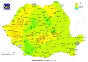 Diferență de 12 grade între o zonă de deal/munte și câmpia din sud, ca și cum ar fi două anotimpuri diferite la doar câteva zeci de kilometri distanță.