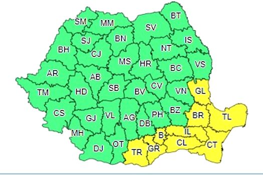 Atenţionarea Cod galben, valabilă de marţi, ora 23:00 până miercuri la ora 23:00, anunţă ninsori însemnate cantitativ în jumătatea de sud-est şi viscolite în Dobrogea, estul Munteniei şi sud-estul Moldovei.