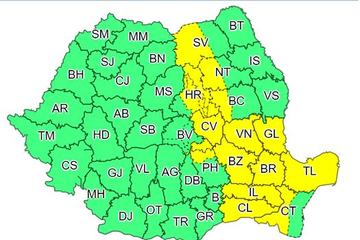 Tot marţi, la ora 12:00 intră în vigoare o alertă Cod galben, până la ora 20:00, valabil pentru zona Carpaţilor Orientali, cea mai mare parte a Dobrogei, sudul Moldovei şi estul Munteniei, instabilitate atmosferică temporar accentuată, cu ploi torenţiale, descărcări electrice, intensificări de scurtă durată ale vântului şi, izolat, grindină.