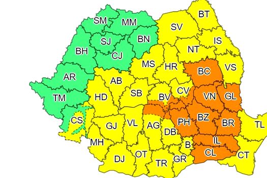 Potrivit ANM, sunt vizate de Codul portocaliu judeţele Bacău, Galaţi, Vrancea, Brăila, Ialomiţa, Călăraşi, Buzău, Prahova şi zona de munte a judeţelor Dâmboviţa, Argeş, Braşov şi Covasna.