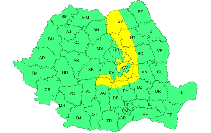 În noaptea de vineri spre sâmbătă, în Carpaţii Orientali şi în estul Carpaţilor Meridionali, vântul va avea intensificări temporare cu viteze de 70…80 km/h, iar la peste 1700 m vor fi rafale de 90…120 km/h.