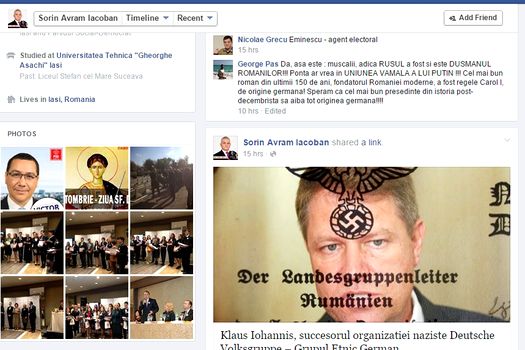 Pe pagina sa de Facebook, deputatul PSD Sorin-Avram Iacoban a distribuit un link şi o fotografie în care apare chipul lui Klaus Iohannis peste care e suprapusă o imagine cu vultur şi svastică. Ulterior, această postare nu a mai putut fi vizualizată.