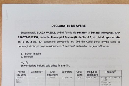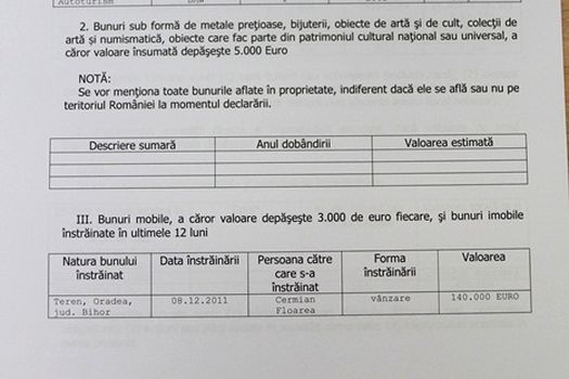 De asemenea, Blaga menţionează că a vândut, anul trecut, cu 140.000 de euro, un teren din Oradea, către Cermian Floarea.