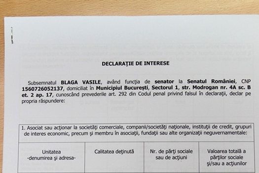 La capitolul „Venituri”, Blaga a notat că a primit în anul fiscal trecut peste 52.000 de lei ca senator.