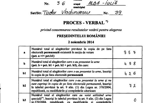 Astfel arată, de exemplu, pagina a doua din procesul verbal al secţiei de votare nr. 36 din Alba-Iulia, strada Tudor Vladimirescu nr. 39: