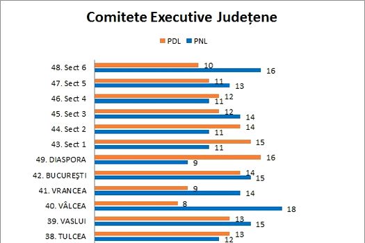 Vechiul PNL are majoritate în 26 de comitete executive judeţene, în timp ce fostul PDL deţine majoritatea în alte 23 de comitete executive judeţene.