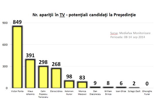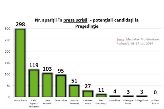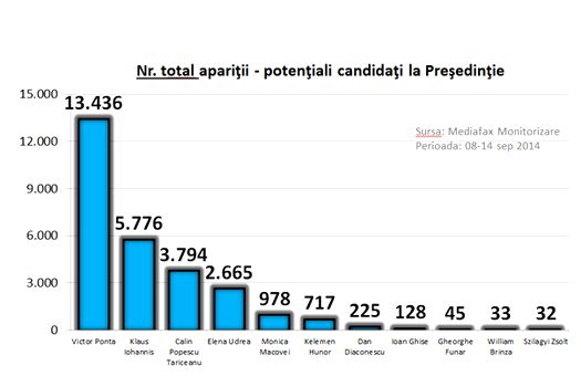 Premierul Victor Ponta conduce în continuare în topul menţiunilor în media, având o creştere de aproape 3.000 faţă de săptămâna precedentă. Din cele 13.436 de apariţii, 12.063 (9.433 în săptămâna 1-7 septembrie) au fost pe site-uri, 849 la TV, 226 la radio şi 298 în titluri din presa centrală.
