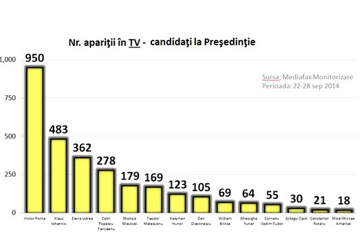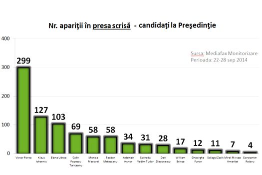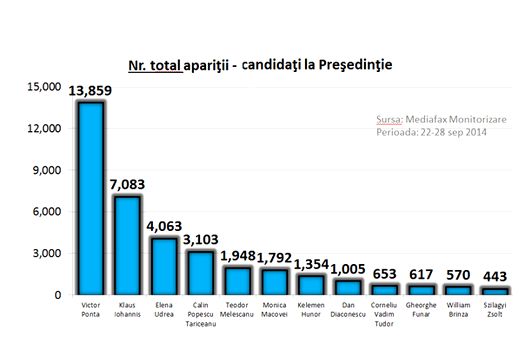 Analiza, realizată în perioada 22 – 28 septembrie, a vizat 150 de titluri din presa centrală, jurnalele de ştiri a 13 posturi TV şi a opt posturi de radio şi 1.287 de site-uri şi 14 candidaţi – Victor Ponta, Klaus Iohannis, Călin Popescu Tăriceanu, Elena Udrea, Monica Macovei, Teodor Meleşcanu, Dan Diaconescu, Kelemen Hunor, Gheorghe Funar, Corneliu Vadim Tudor, William Brânză, Szilagy Zsolt, Constantin Rotaru şi Mirel Mircea Amariţei.