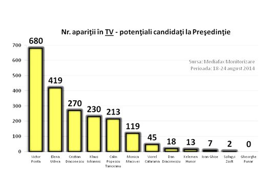 Astfel, premierul Victor Ponta a avut 256 de apariţii în presa scrisă, 190 la posturi de radio, 680 la posturi TV şi 7.626 pe site-uri, atât din postura de şef al Executivului, cât şi din cea de lider politic, totalizând 8.752 de apariţii.