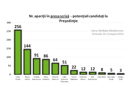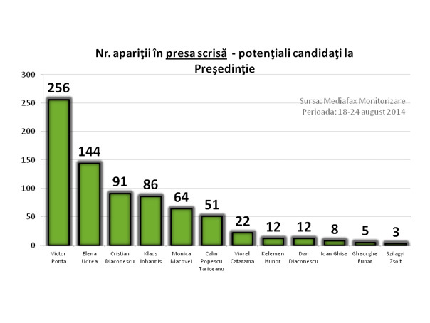 Acestea sunt rezultatele celei de a doua analize săptămânale realizate de Mediafax Monitorizare, în perioada 18 – 24 august, pe baza apariţiilor şi menţiunilor în 150 de titluri de presă scrisă, în jurnalele de ştiri difuzate la 8 posturi de radio şi la 13 posturi de televiziune, precum şi pe 1.244 site-uri, pentru 12 candidaţi sau potenţiali candidaţi la Preşedinţie. Spre deosebire de precedenta analiză, aceasta o include şi pe Elena Udrea care, în perioada monitorizată, şi-a oficializat candidatura pentru Cotroceni, din partea PMP, ca urmare a deciziei lui Cristian Diaconescu de a candida ca independent.
