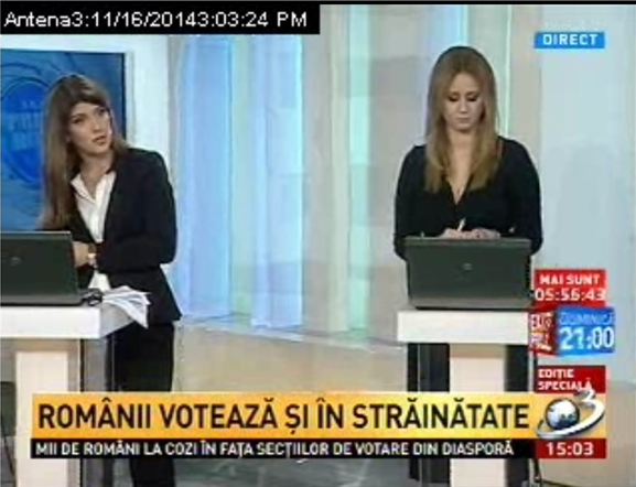 Antena 3 a prezentat cu întârziere şi pe scurt imagini de la cozile la urne din străinătate, titrând “mii de români la cozi în faţa secţiilor de votare din diaspora”, dar susţinând că “numărul secţiilor a fost modificat în mai multe ţări” şi că “s-au luat toate măsurile pentru fluidizarea votului”.