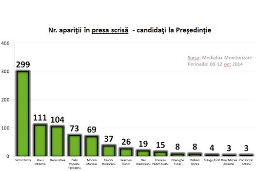 Premierul Victor Ponta se menţine pe primul loc în topul apariţiilor media, la mare distanţă de ceilalţi candidaţi, înregistrând şi o creştere a numărului de apariţii, după o săptămână în care a scăzut. El a crescut de la un total de 12.332 de menţiuni în săptămâna 6-12 octombrie la 12.945 în săptămâna care s-a încheiat – 11.748 pe site-uri, 699 la TV, 199 la radio, 299 în presa centrală.