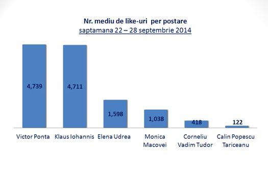 La numărul mediu de like-uri pe postare, topul este condus de Victor Ponta – 4.739, Klaus Iohannis – 4.711, Elena Udrea – 1.598, Monica Macovei – 1.038, Corneliu Vadim Tudor – 418 şi Călin Popescu Tăriceanu – 122.