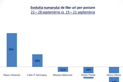 Evoluţia numărului de like-uri pe postare faţă de săptămâna precedentă arată creşteri la Klaus Iohannis – 76% şi Călin Popescu Tăriceanu – 28% şi scăderi la Monica Macovei – 11%, Victor Ponta – 26%, Elena Udrea – 47%.