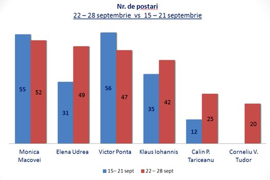 Săptămâna precedentă, Ponta era urmat în topul numărului de postări de Monica Macovei, cu 55 postări, 60.927 like-uri, 4.034 comentarii şi 9.748 share-uri, Klaus Iohannis, cu 35 de postări, 99.619 like-uri, 3.408 comentarii şi 7.029 share-uri, Elena Udrea – 31 postări, 77.026 like-uri, 4.411 comentarii şi 7.902 share-uri, Călin Popescu Tăriceanu – 12 postări, 1.179 like-uri, 74 comentarii şi 163 share-uri.