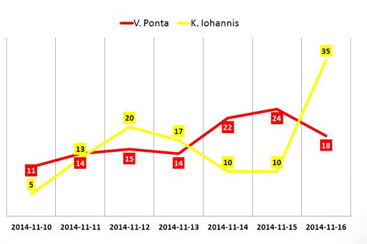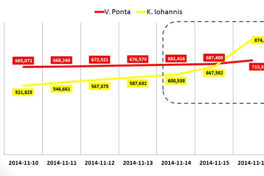 Analizând situaţia pe zile în ultima săptămână se observă că sâmbătă, 15 noiembrie şi mai ales duminică, 16 noiembrie, interacţiunea lui Iohanis cu fanii creşte brusc ajungând la 2.759.088 în ultima zi, la o diferenţă imensă faţă de Ponta, cu 294.684, ceea ce ar putea explica parţial şi rezultatul de la urne.