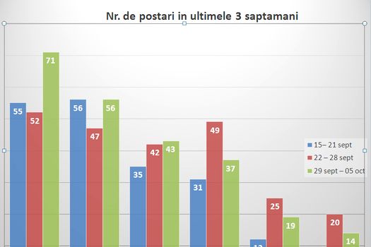 Monica Macovei (71 de postări faţă de 52 săptămâna anterioară) a adunat 74.636 like-uri, 3.698 comentarii şi 9.395 share-uri, faţă de 53.984 like-uri, 3.394 comentarii şi 7.662 share-uri, în săptămâna 22 – 28 septembrie.