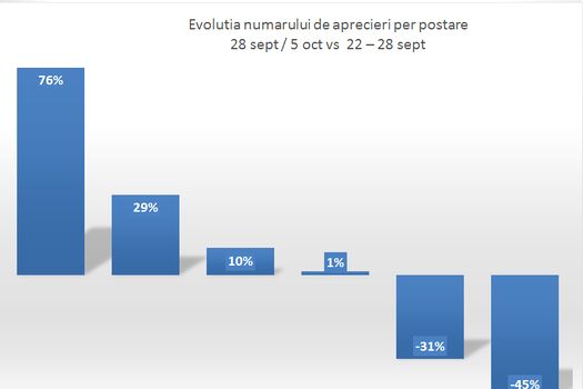Evoluţia numărului de aprecieri pe postare faţă de săptămâna precedentă arată o creştere de 76% la Klaus Iohannis, el fiind urmat de Elena Udrea – 29%, Călin Popescu Tăriceanu – 10%, Monica Macovei – 1% şi scăderi la Victor Ponta, cu 31% şi la Corneliu Vadim Tudor, cu 45%.