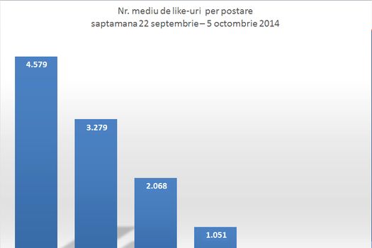 La numărul mediu de like-uri pe postare, topul este condus de Klaus Iohannis – 4.579, urmat de Victor Ponta – 3.279, Elena Udrea – 2.068, Monica Macovei – 1.051, Corneliu Vadim Tudor – 230 şi Călin Popescu Tăriceanu – 134.