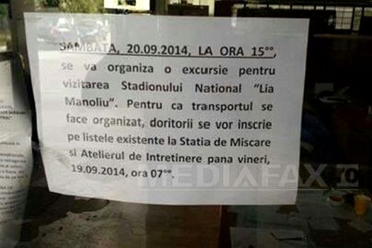 „Sâmbătă, 20.09.2014, la ora 15.00, se va organiza o excursie pentru vizitarea Stadionului Naţional ‘Lia Manoliu’. Pentru că transportul se face organizat, doritorii se vor înscrie pe listele existente la Staţia de Mişcare şi Atelierul de întreţinere până vineri, 19.09.2014, ora 7.00”, a fost textul anunţului lipit, în această săptămână, pe geamuri de la autobaza Obregia a Regiei Autonome de Transport Bucureşti (RATB).