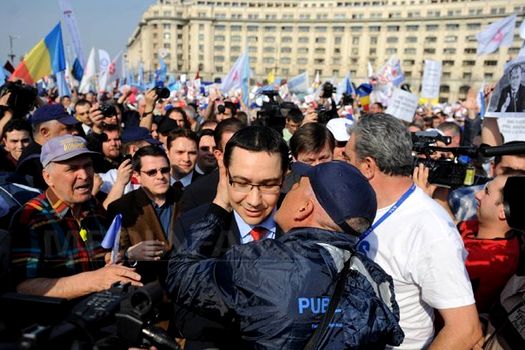 Ponta şi Antonescu s-au oprit în faţa scenei din Piaţa Constituţiei, i-au salutat pe protestatari şi au aplaudat.