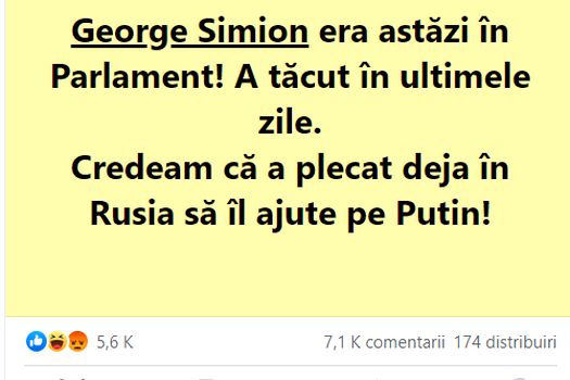 Deputatul USR Iulian Bulai a scris pe Facebook că „George Simion era astăzi în Parlament! A tăcut în ultimele zile. Credeam că a plecat deja în Rusia să îl ajute pe Putin!”