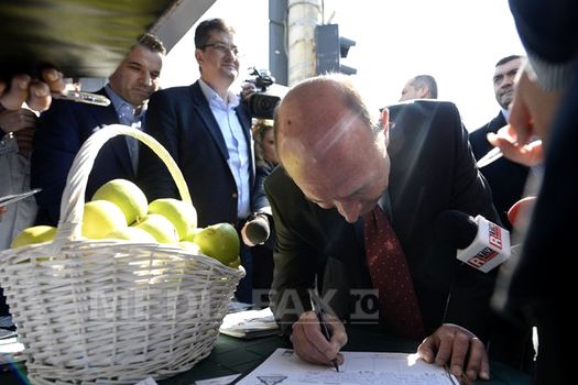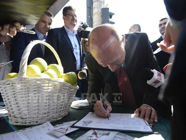 Preşedintele a dat mâna cu cei care strâng semnături, a semnat şi apoi a primit două mere de la aceştia, spunând că unul este pentru soţia sa, iar unul pentru nepoţica Anais.